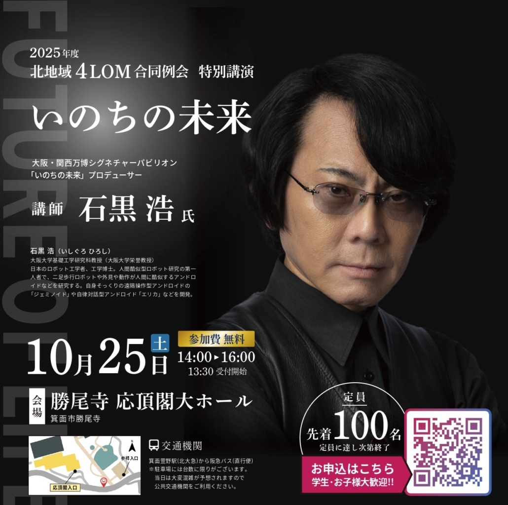 10月25日(土)、勝尾寺 応頂閣大ホールにて【2025年度北地域4LOM合同例会 石黒浩氏 講演~いのちの未来~】を池田JC・吹田JC・豊中JC・箕面JCが合同で実施いたします!
